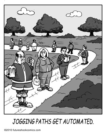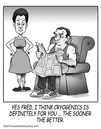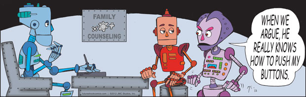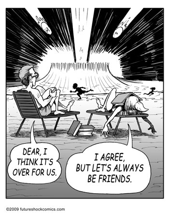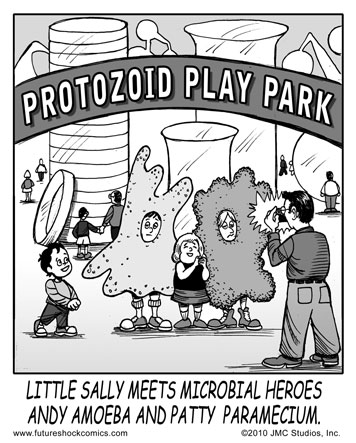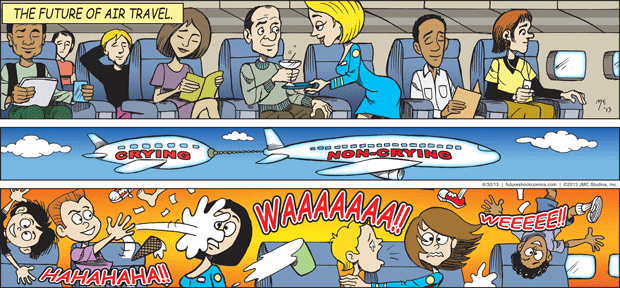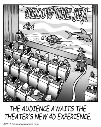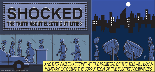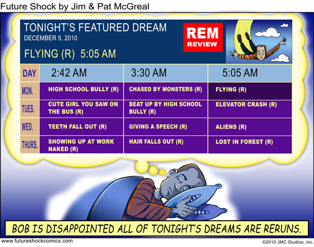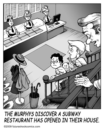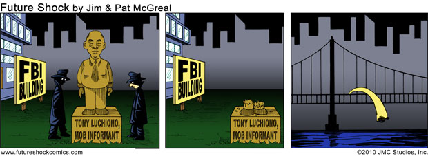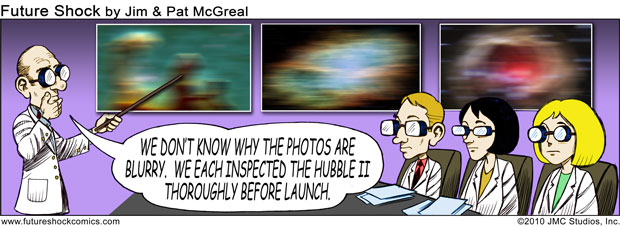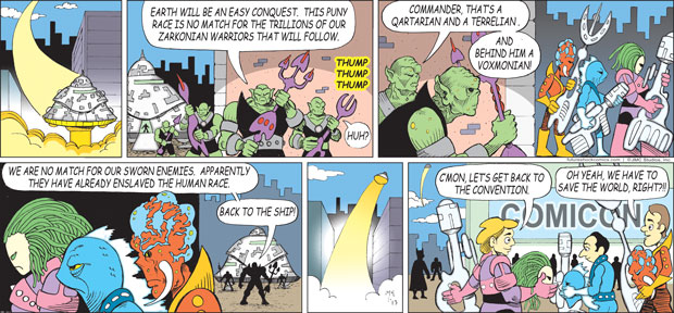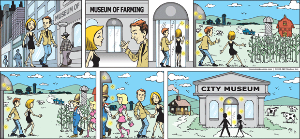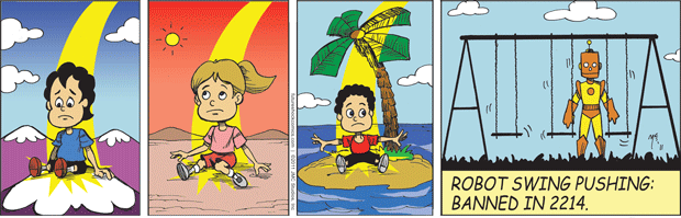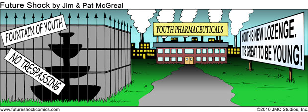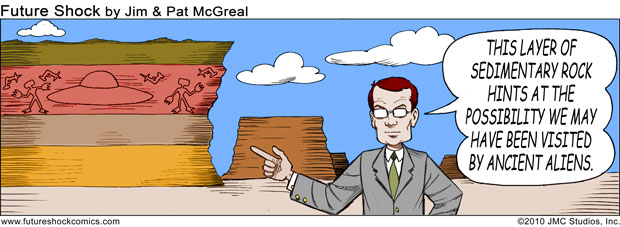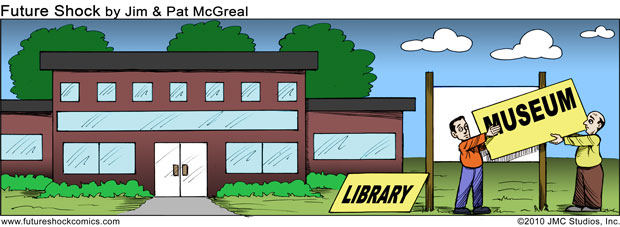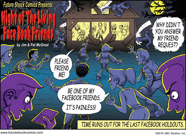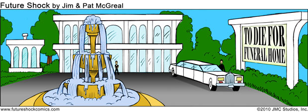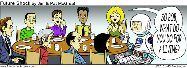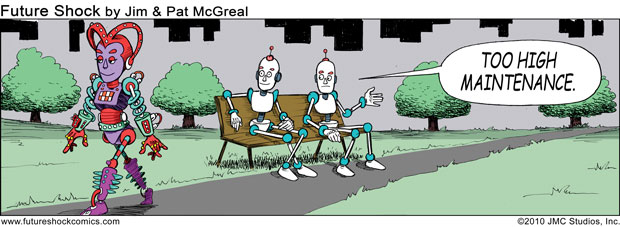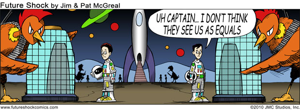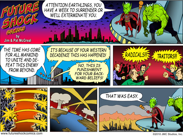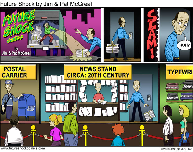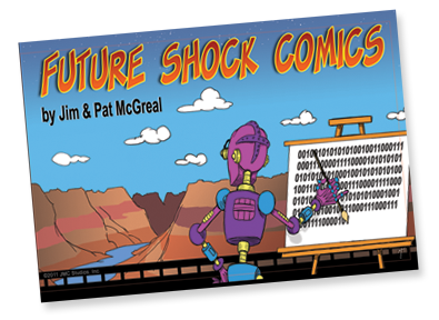 Future Shock Comics was a self-syndicated comic strip that ran from 2009 through 2015. It was created by Jim and Pat McGreal. It began as a single panel strip in black and white, but evolved into a daily color strip at the request of newspaper editors. At it’s peak, it appeared 25 newspapers nationwide, including the Sunday Comics pages of the Chicago Tribune.